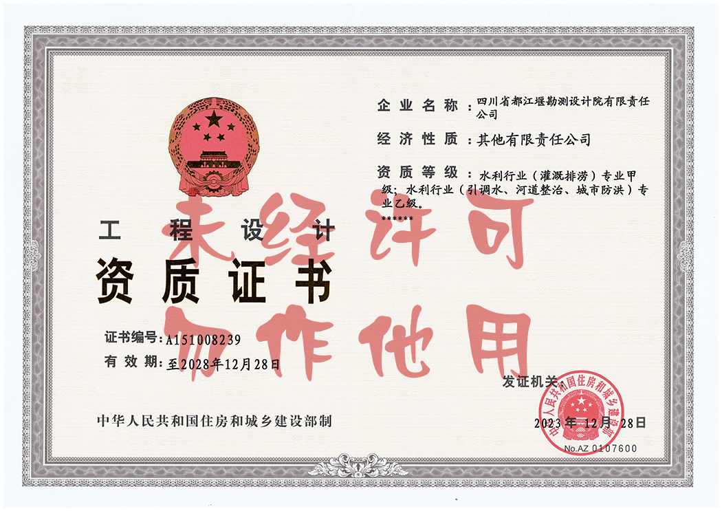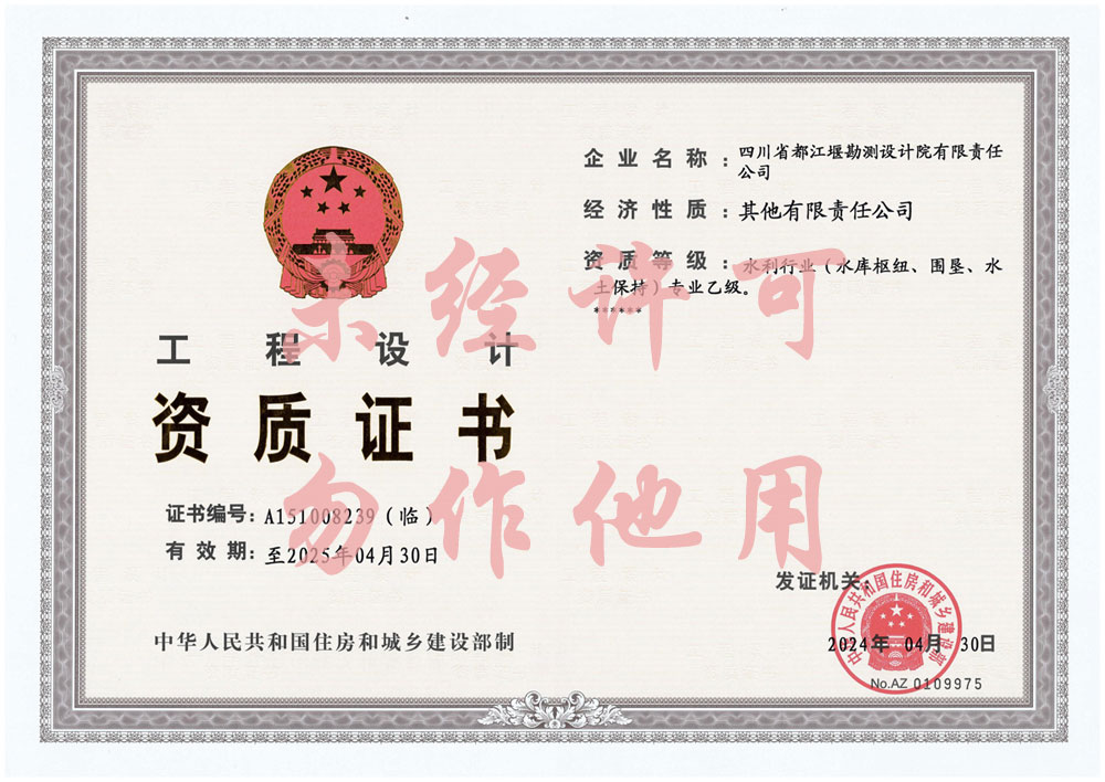 四川省都江堰勘測(cè)設(shè)計(jì)院有限責(zé)任公司是一家專業(yè)從事水利水電工程勘察設(shè)計(jì)的專業(yè)甲級(jí)設(shè)計(jì)院,目前具有水利行業(yè)(灌溉排澇)專業(yè)甲級(jí)、水利行業(yè)(引調(diào)水、河道整治、城市防洪)專業(yè)乙級(jí)、電力行業(yè)(水力發(fā)電(含抽水蓄能、潮汐))專業(yè)乙級(jí)、市政行業(yè)(道路工程、橋梁工程)專業(yè)乙級(jí)、水利行業(yè)(水庫(kù)樞紐、圍墾、水土保持)專業(yè)丙級(jí)設(shè)計(jì)資質(zhì)、工程勘察專業(yè)類(巖土工程、水文地質(zhì)、工程測(cè)量)乙級(jí)資質(zhì)和水利工程咨詢、項(xiàng)目管理丙級(jí)資質(zhì),通過了ISO9001:2008質(zhì)量體系國(guó)際標(biāo)準(zhǔn)認(rèn)證。